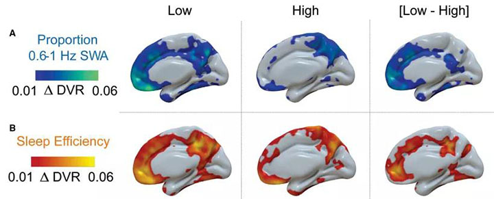 人的睡眠主要分为快速眼动(REM)睡眠和非快速眼动(NREM)睡眠两大部分,前者也叫快波睡眠,后者可被称为慢波睡眠。先前的研究表明,睡眠效率(总睡眠量占总卧床时间的百分比)和0.6-1Hz的慢波睡眠活动(SWA)频率比例与Aβ的变化有关。