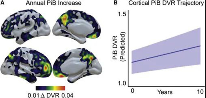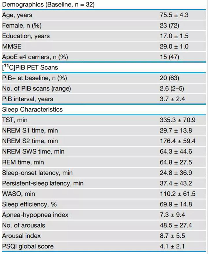 总体而言,参与者接受了平均时间为3.7年(±2.4)的随访,在此期间研究人员多次利用正电子发射断层扫描(PET)定期跟踪参与者大脑中Aβ的增长率,将这些人的Aβ水平与其睡眠状况进行比较,并使用线性混合效应模型推导出每个受试者的Aβ负荷随时间变化的速率变化量。