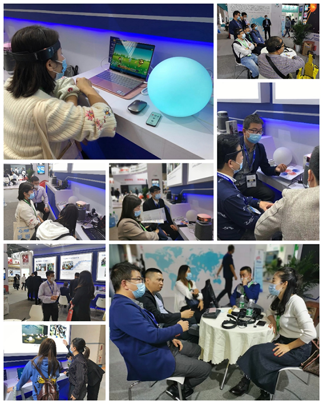 在视友科技展位,工作人员向大家展示了脑机接口技术研究的最新成果:Ego正念脑波训练系统和大脑360脑科学训练系统,引起了观众的围观。