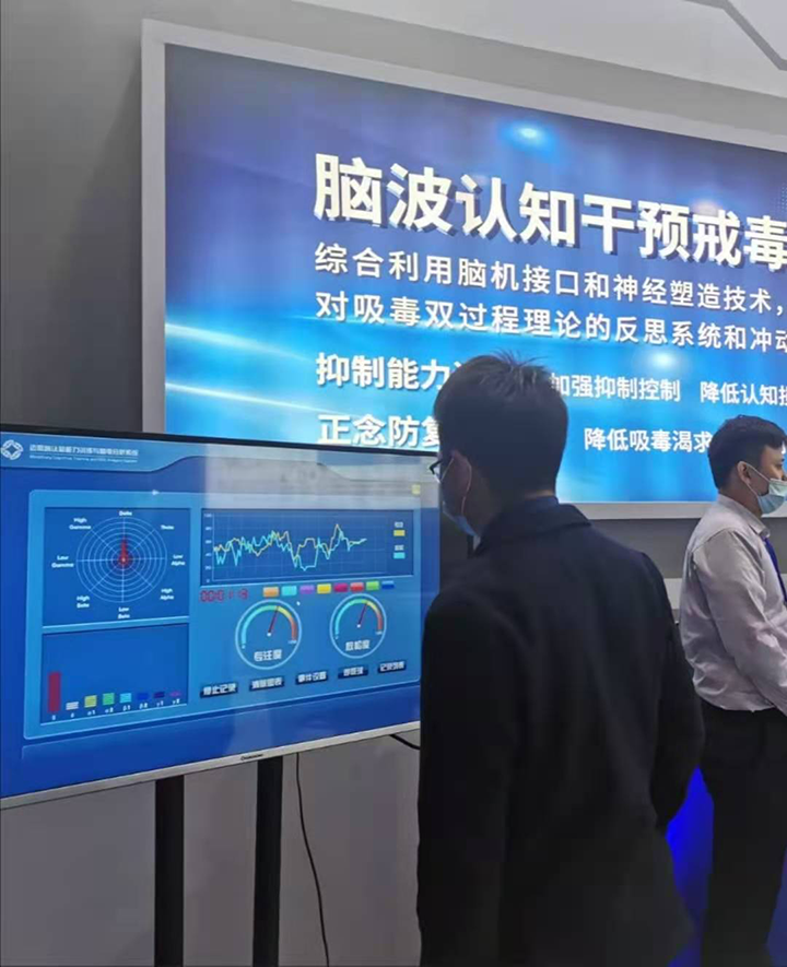 视友科技在本次展会上推出了脑电波认知行为疗法戒毒的两大产品,迈思睿认知能力干预戒毒及佰意通正念防复吸戒毒脑机接口产品。