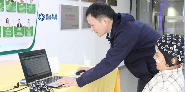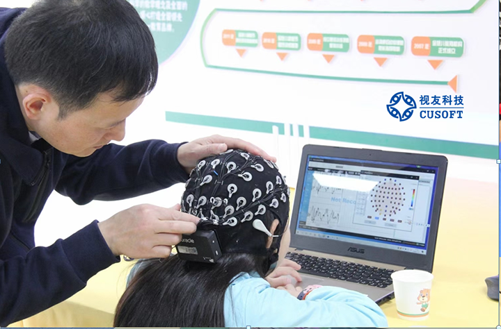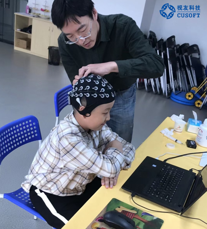 清华大学医学院医学数据技术研究中心-北京视友科技脑与智能教育联合研究室的研究员给孩子佩戴电极帽