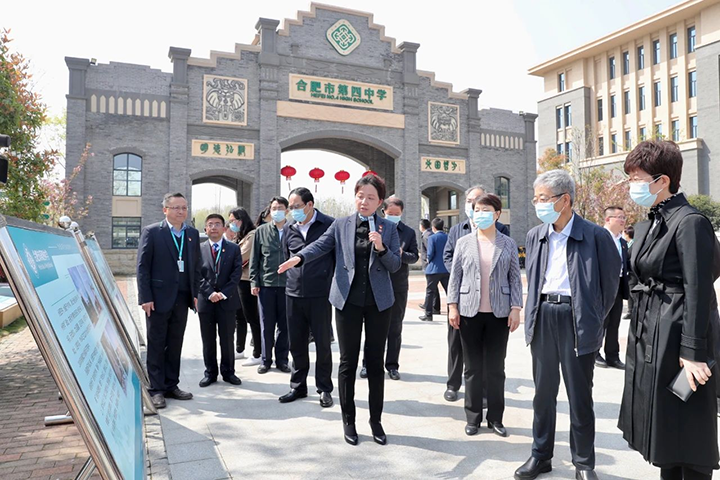 2021年3月29日上午,教育部党组书记、部长陈宝生一行莅临合肥四中,就学校五育并举落实情况、校园文化建设和信息化及智慧学校建设与运用情况进行专题调研。教育部办公厅主任王光彦、发展规划司司长刘昌亚、教育督导局局长田祖荫、办公厅正处级秘书王绍磊、发展规划司事业发展处处长龚卫华,安徽省人民政府副省长王翠凤、副秘书长左俊,安徽省委教育工委书记钱桂仑,安徽省教育厅厅长赵振华、副厅长徐静平,合肥市人民政府市长凌云,合肥市教育局局长王杰才、副局长王勇等陪同调研。合肥四中校长吴英明,副校长李昌年、彭强、赵勇等参与接待。