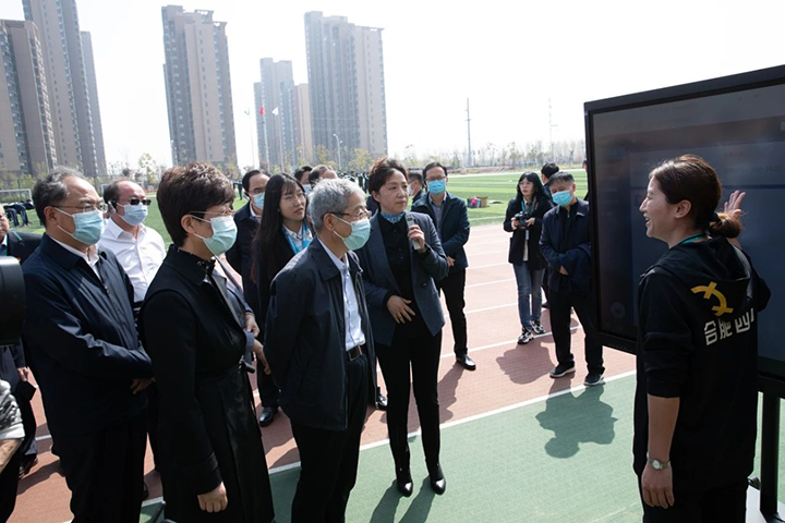 田径场上,陈宝生一行实地观摩了合肥四中智慧体育相关场景。六个班级的学生正在参与智慧体育选修课程,包括太极、轮滑、瑜伽、篮球等项目,每个学生均配备运动手环,实时反馈运动状态及数据。在立定跳远训练场地,随着学生发力、跃起、落地一整套动作的完成,其最终成绩以及各环节动作影像均呈现在教师端,以便教师能及时、准确地纠正学生运动姿势等。在100米短跑的赛道上,学生佩戴智慧手环,随着发令枪响,学生迅速奔向终点,一组运动状态中的实时数据迅速传递到教师端,以便教师能全面、科学地掌握学生运动状态等。得知合肥四中师生全员都在练习太极拳后,陈宝生指出,“这样的举措非常好,既能强健体魄砥砺意志、又能传播中华民族传统文化”。
