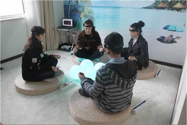 工作人员说:她现在的状态很放松。于是她想尝试一下,提升自己焦虑的情绪,让灯光变色。