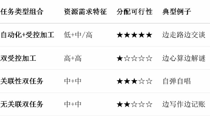 · 任务间的内在关联:当任务形成协同反应系统时,资源消耗显著降低。例如售货员的“唱收唱付”将口头报价与包装动作整合为统一流程,而毫无联系的任务(如边背单词边下棋)则导致资源竞争9。
