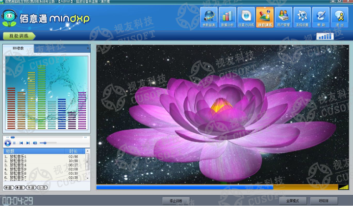 “荷花冥想”就是整个“佰意通”系统最具代表性的脑电训练项目之一。屏幕上的这朵荷花就是使用者当前大脑状态的一个具象,把脑波这个抽象的数据可视化。荷花的美丽与否,与使用者状态正常与否是呈直接联系的。整个冥想过程还会运用诸如系统自带的思语脑波灯(脑波灯的几个颜色分别对应使用者不同程度的内心状态)的颜色变化和集成音频播放器等,一步步引导使用者进行“自我调和”。