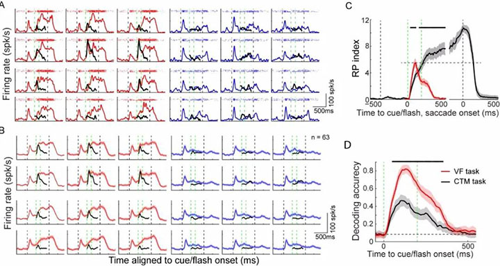 图 2. 后顶叶皮层单神经元与群体神经元在参与多个刺激位置向单个眼动目标点映射过程中的反应,以及神经元在感受野中的单纯的视觉反应。