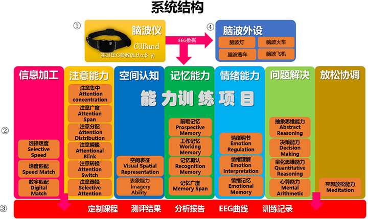 在使用过程中,迈思睿使用脑电设备实时采集并记录使用者的多项脑电生理信号。系统采用CUBand便携式脑波仪作为前端脑电测量设备,可实时获取使用者的脑电数据以及反映使用者心理状态和情绪状态的多项指标参数。CUBand脑波仪具有佩戴简单、使用方便、安全舒适、稳定可靠等诸多等优势,可适应于各类人群和各种日常环境。通过对脑电数据和实验数据的综合记录和分析,迈思睿可以对使用者认知能力进行更准确的评价。