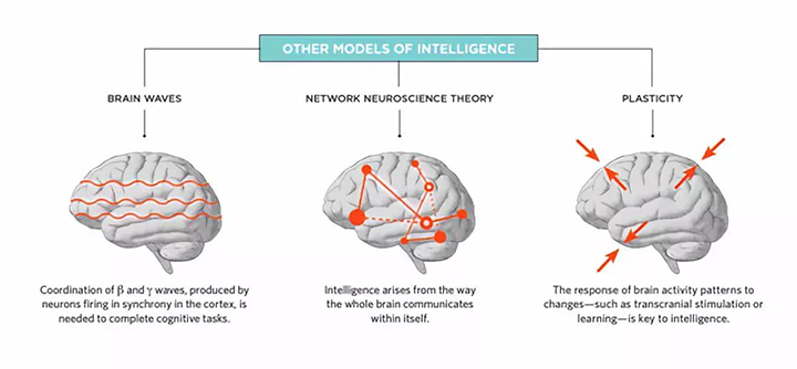 从左到右:脑波:皮层中神经元同步放电产生的β波和γ波的谐波,是完成认知任务的必需;网络神经科学理论:智力产生于大脑内部的整体通讯;可塑性:大脑对变化的响应